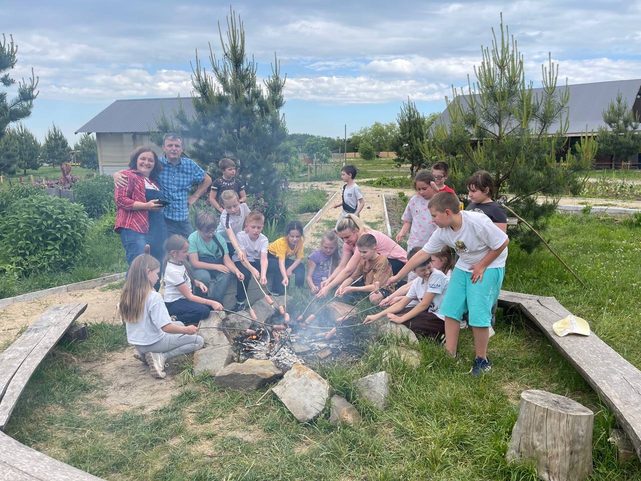 Перерва на обід: смажимо ковбаски на вогні (з допомогою та під наглядом дорослих). До ковбасок запропонуємо несолодкі булочки, сезонні фрукти, чай. За бажанням можете приготувати дітям канапки і в цей час обіду ми їм поставимо на стіл.