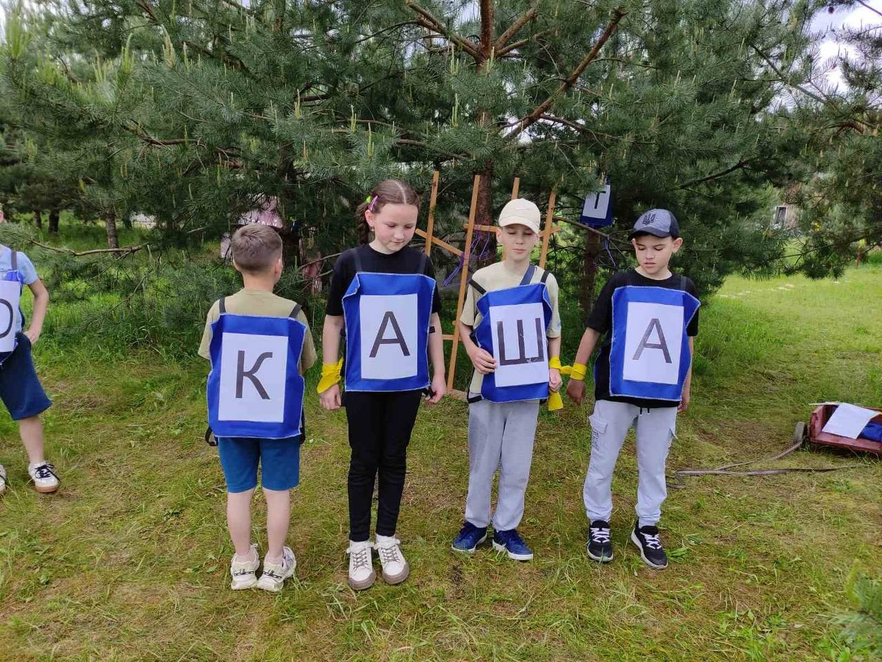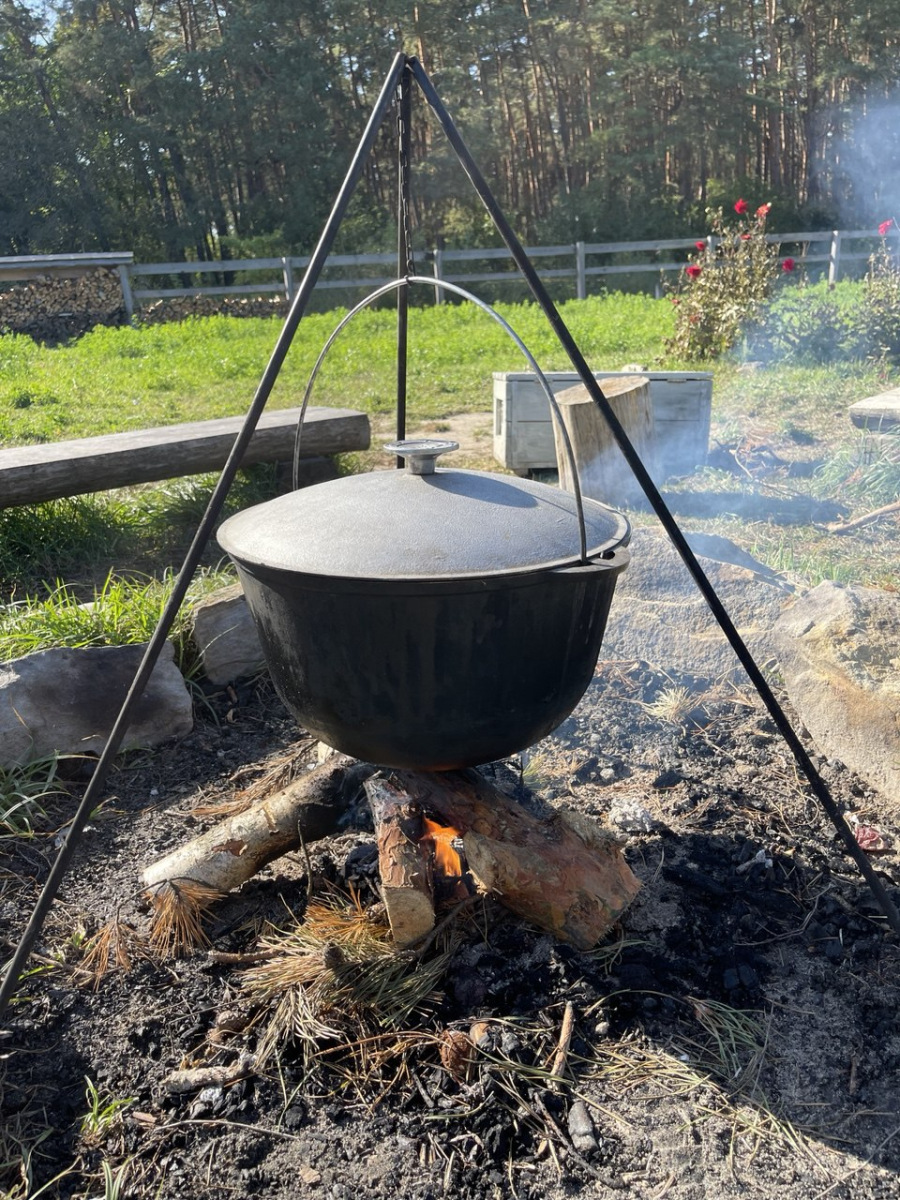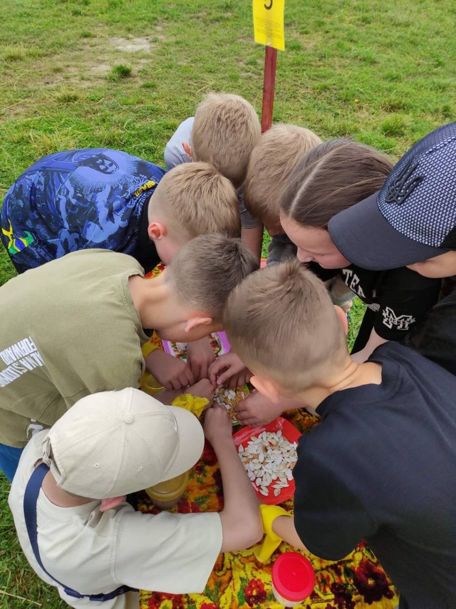 Квестова гра – Діти отримують давній свиток з рецептом «Їжі лісових велетів». Їх завдання – пройти випробовування, щоб знайти складники цієї страви. Проходимо цікаві завдання на логіку, силу, кмітливість, швидкість, уважність. Щоб діти мали доступ до реквізиту та навчилися взаємодіяти, то ділимо їх на команди випадковим чином. В цій грі працюємо над формуванням команди та командного духу, на один результат – не змагаємося. Всі знайдені в цікавій грі складники приносимо до вогнища, де за казаном працюватиме доросла людина і варимо їжу з того, що роздобули. Щоб дітям не було скучно стояти, наш куратор почне варити завчасу, ще під час гри і з дітьми ми тільки до варимо та заправимо спеціями.